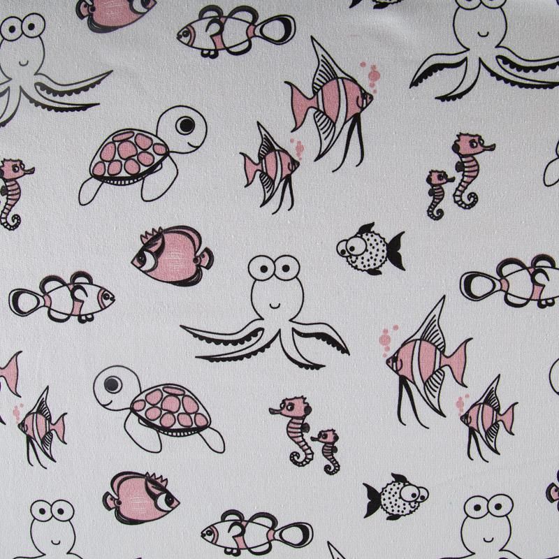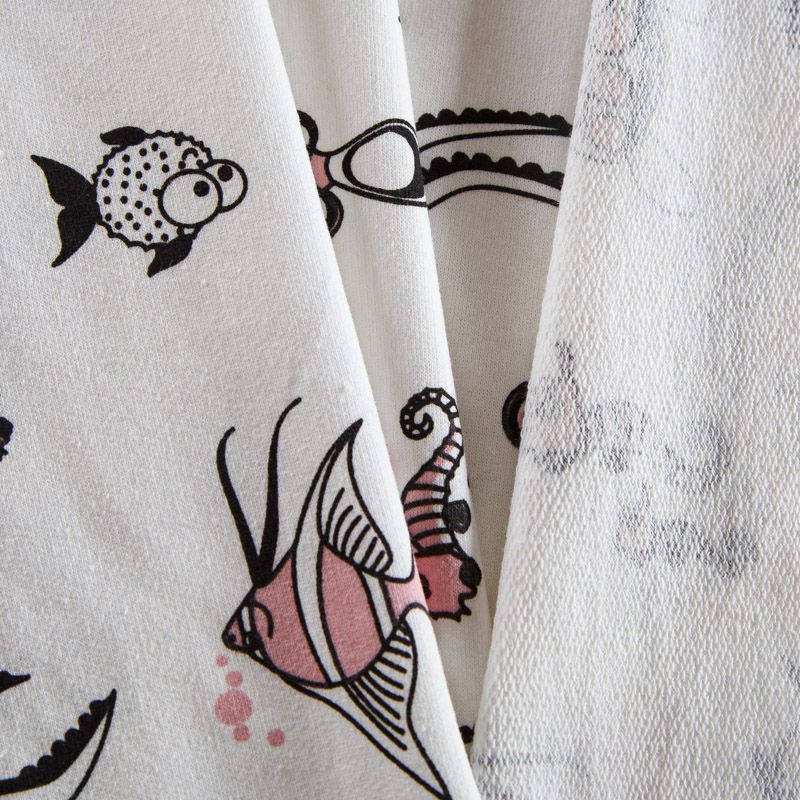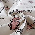 Итальянский хлопковый мягкий эластичный трикотаж средней плотности. Лицевая сторона гладкая, без блеска, мелкой вязки с детским принтом. Изнанка – с небольшим однородным ворсом или петля. Прекрасный вариант для пошива платьев и костюмов, легких толстовок, свитшотов, спортивной, детской и  домашней одежды.