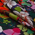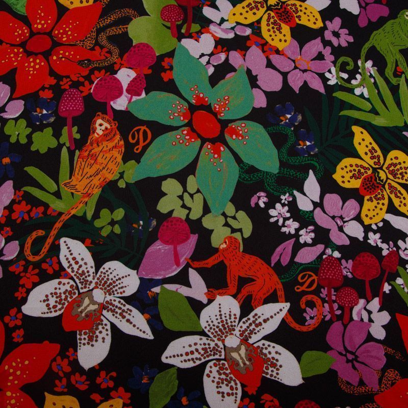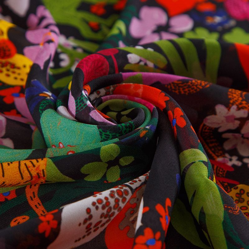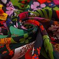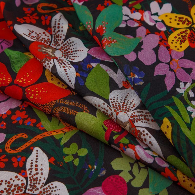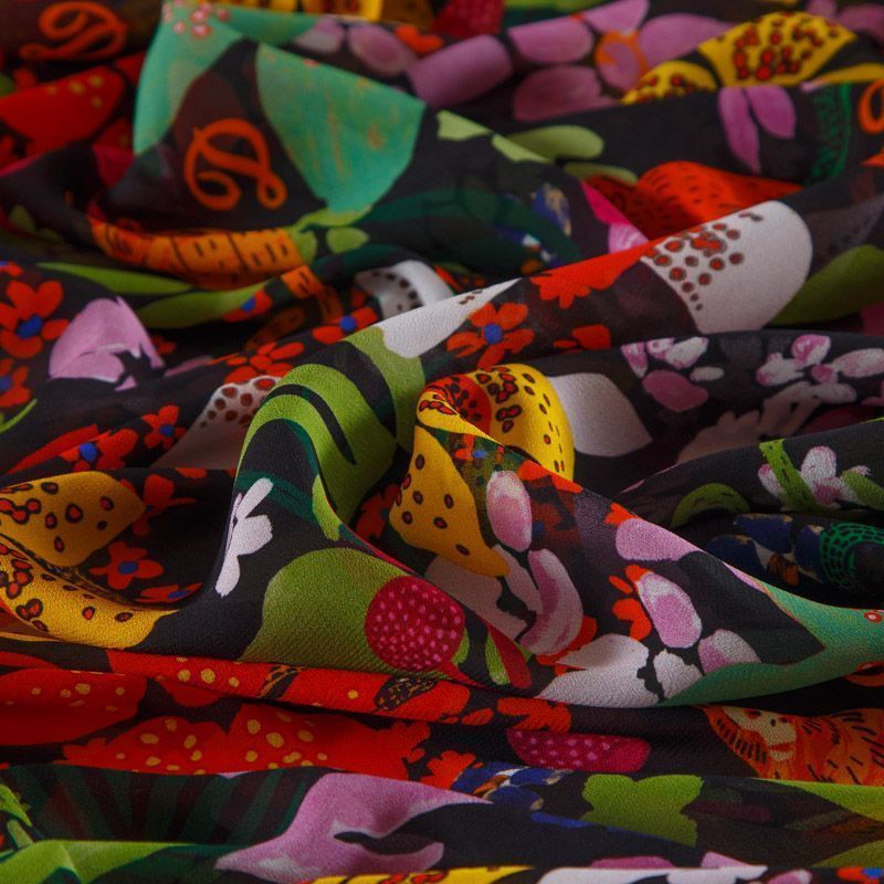 Итальянский вискозный креп-шифон со стилизованным ярким цветочным принтом на черном фоне. Ткань просвечивает, пластичная, легкая, отлично драпируется и струится. Подойдет для пошива блузки, туники, платья, юбки, парео.