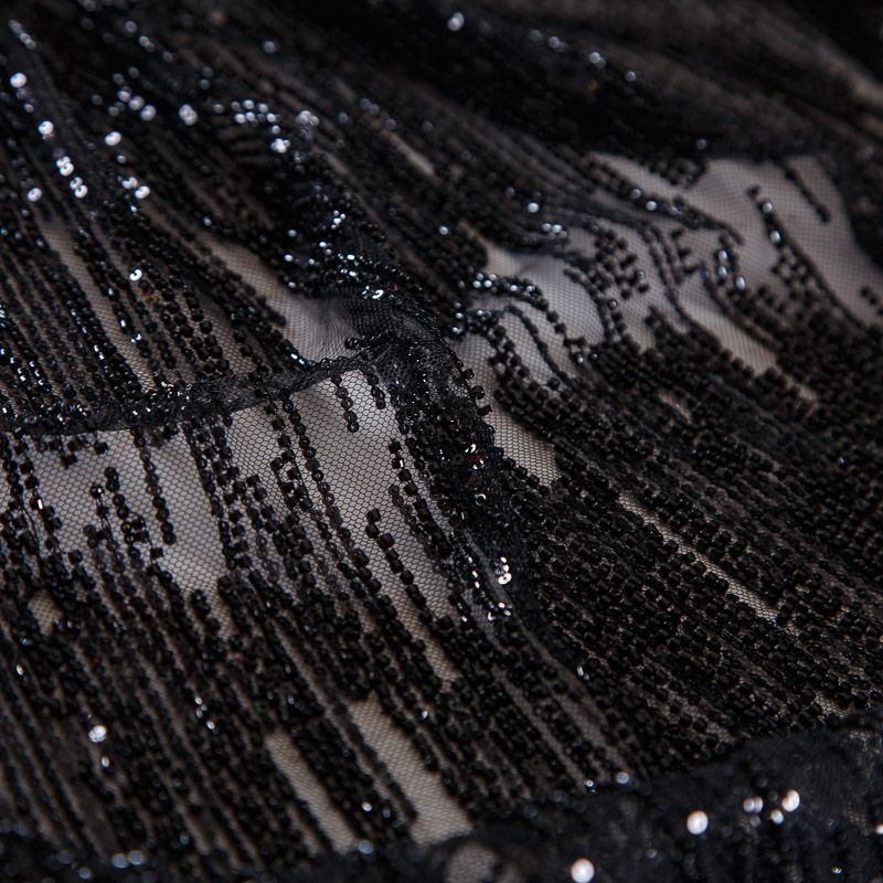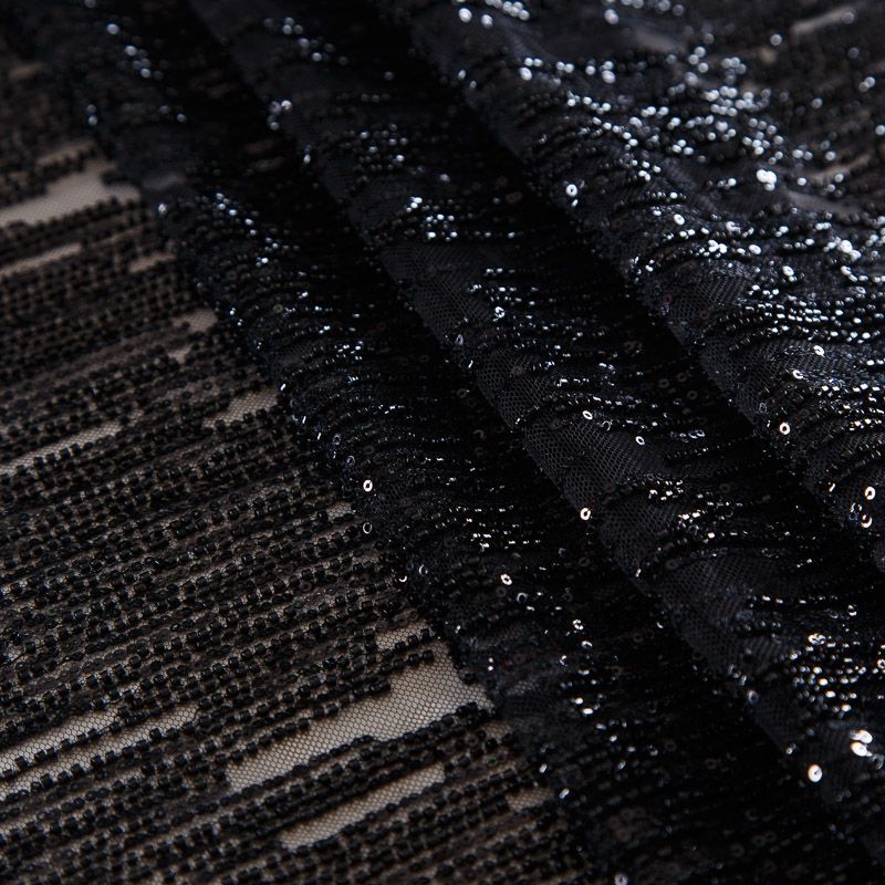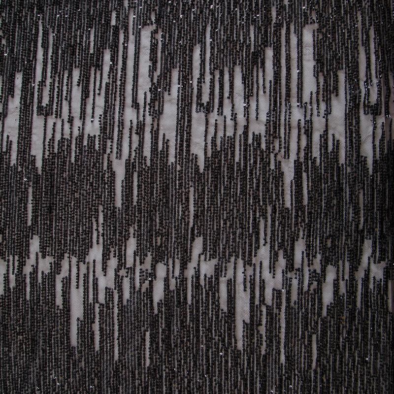 Мягкая сетка, густо расшитая пайетками и стеклярусом в тон полотна. Узор напоминает северное сияние, расположен по ширине полотна. Подходит для пошива нарядной одежды, платья, юбки, комбинезона. Требуется подклад, материал набирается объемом.