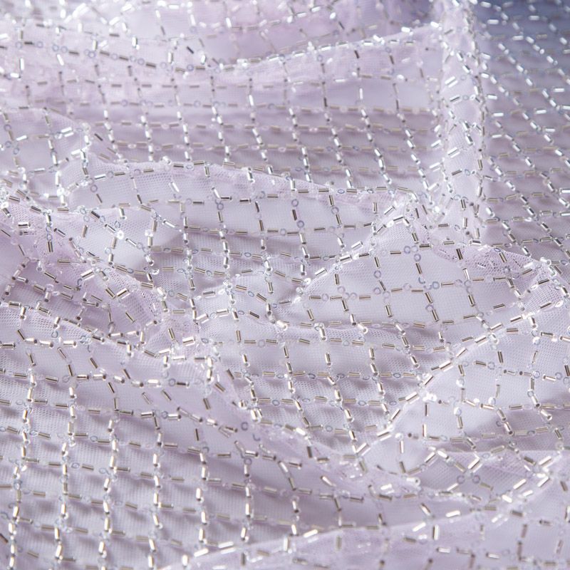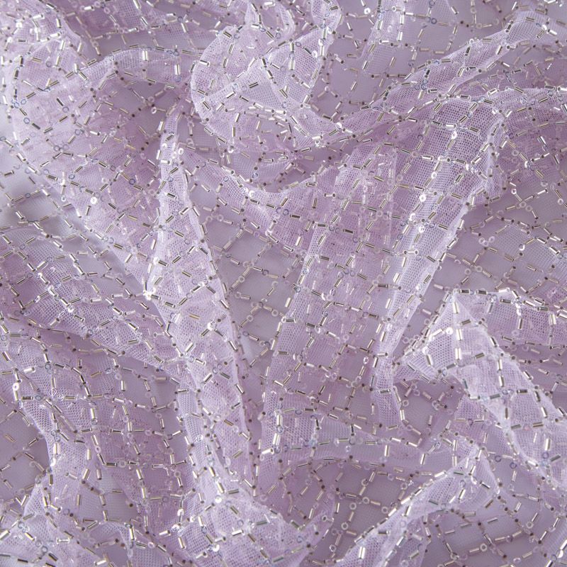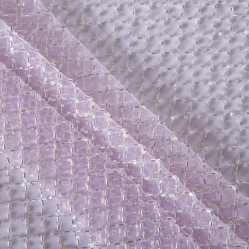 Эластичная мягкая сетка светло-сиреневого оттенка, расшитая стеклярусом и пайетками в тон основы. Геометрический дизайн делает полотно универсальным в использовании. Итальянская сетка прекрасно подходит для пошива праздничных нарядов, платьев, юбок и топов для торжественных случаев, а также отделки аксессуаров.