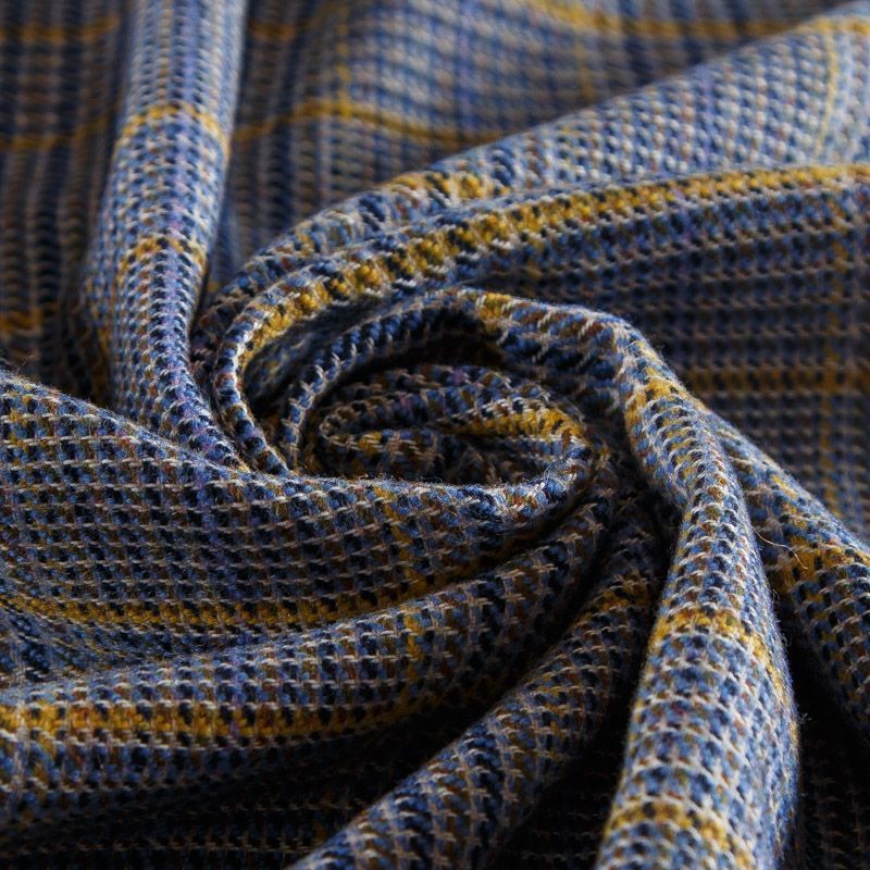 Итальянская костюмно-плательная смесовая шерсть средней плотности, не сухая, пластичная, приятная на ощупь, формоустойчива, не мнется, хорошо драпируется. Красивая клетка тартан образована за счет сочетания полос синего, голубого, желтого и песочного оттенков. Ткань отлично подойдет на костюм, жилет, жакет, легкое пальто, юбку, брюки, плате, сарафан, шорты.