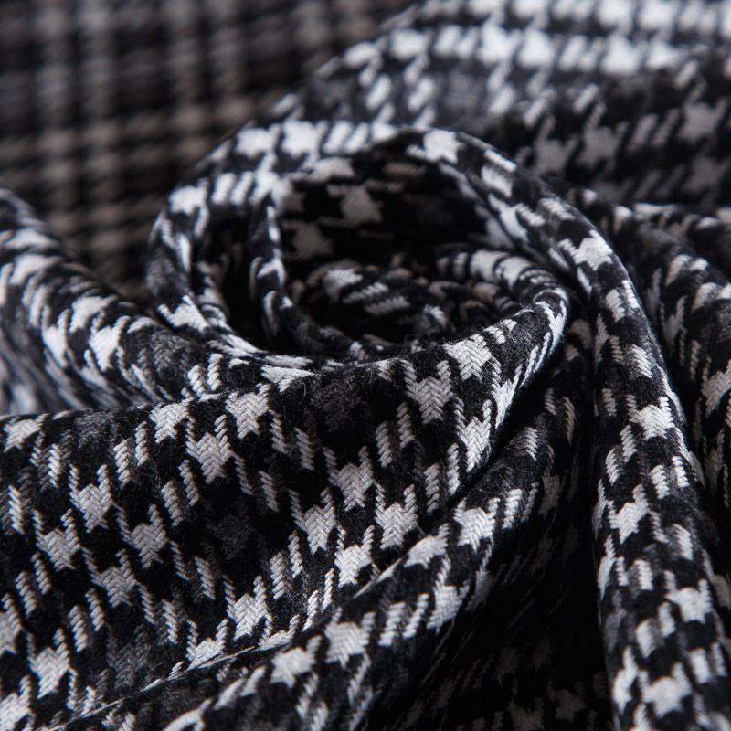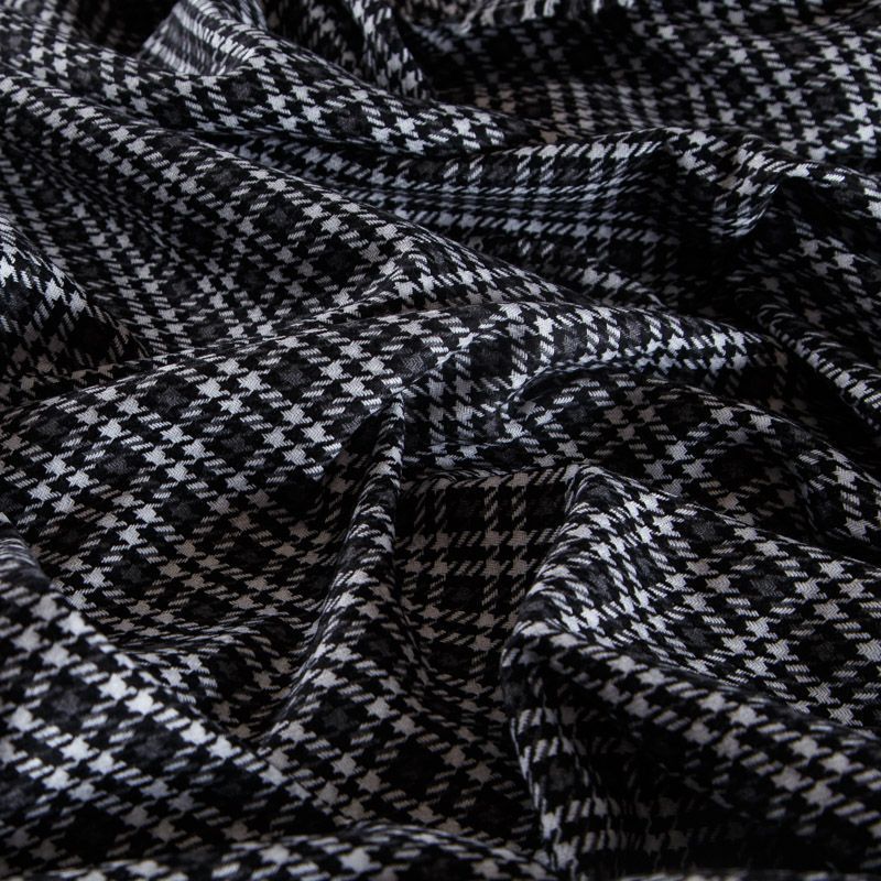 Итальянская костюмно-плательная смесовая ткань средней плотности в белом оттенке в мелкую серо-черную клетку. Ткань не сухая, формоустойчивая, пластичная, приятная на ощупь, почти не мнется, хорошо драпируется. Ткань отлично подойдет на костюм, жилет, жакет, легкое пальто, юбку, брюки, платье, сарафан, шорты.