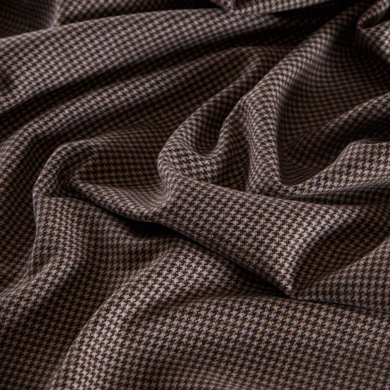 Итальянская костюмно-плательная шерсть средней плотности в бежевом оттенке в мелкую куриную лапку. Ткань не сухая, пластичная, приятная на ощупь, почти не мнется, хорошо драпируется. Ткань отлично подойдет на костюм, жилет, жакет, легкое пальто, юбку, брюки, платье, сарафан, шорты.