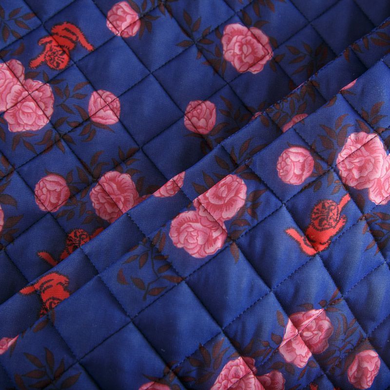 Итальянская трехслойная курточная ткань сапфирового оттенка с ярким принтом, простеганная ромбами. Нижний слой - гладкий матовый полиэстер синего цвета, средний слой - синтепон, верхний - принтованный. Очень мягкая и легкая, пластичная, хорошо драпируется. Прекрасно подойдет для пошива легких пальто, бомберов, парки, курток, жилетов, накидок-кейпов, объемных сумок.