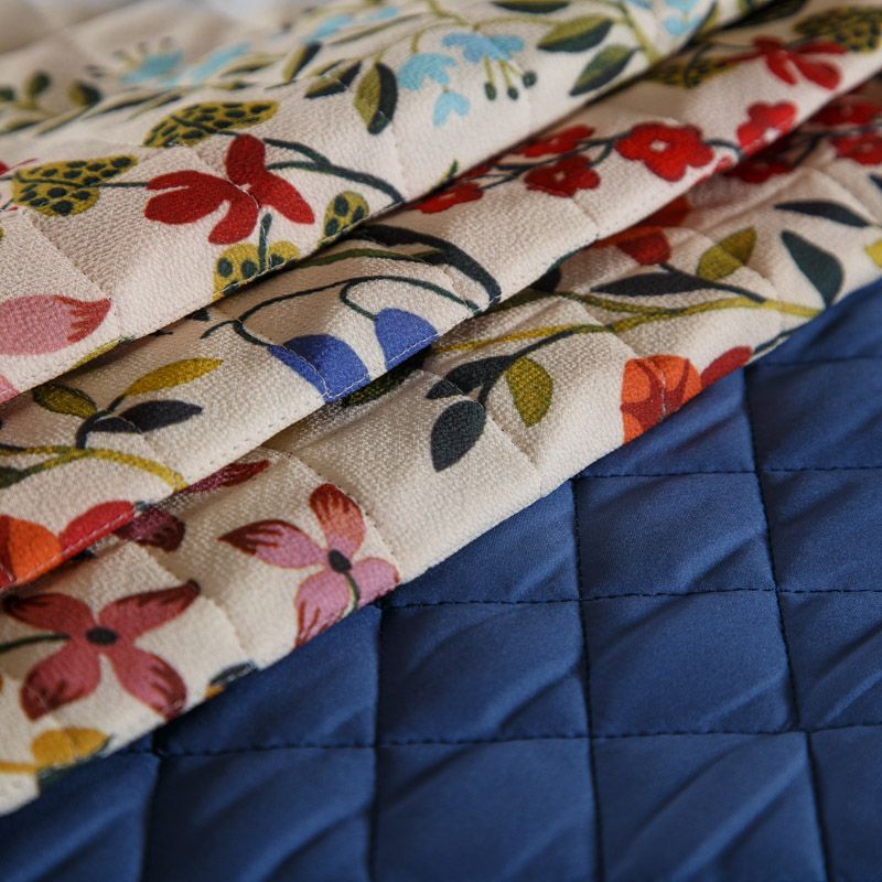 Итальянская трехслойная курточная ткань насыщенного молочного цвета с ярким принтом, простеганная ромбами. Нижний слой - гладкий матовый полиэстер синего цвета, средний слой - синтепон, верхний - принтованный креп-шифон. Очень мягкая и легкая, пластичная, хорошо драпируется. Прекрасно подойдет для пошива легких пальто, бомберов, парки, курток, жилетов, накидок-кейпов, объемных сумок.